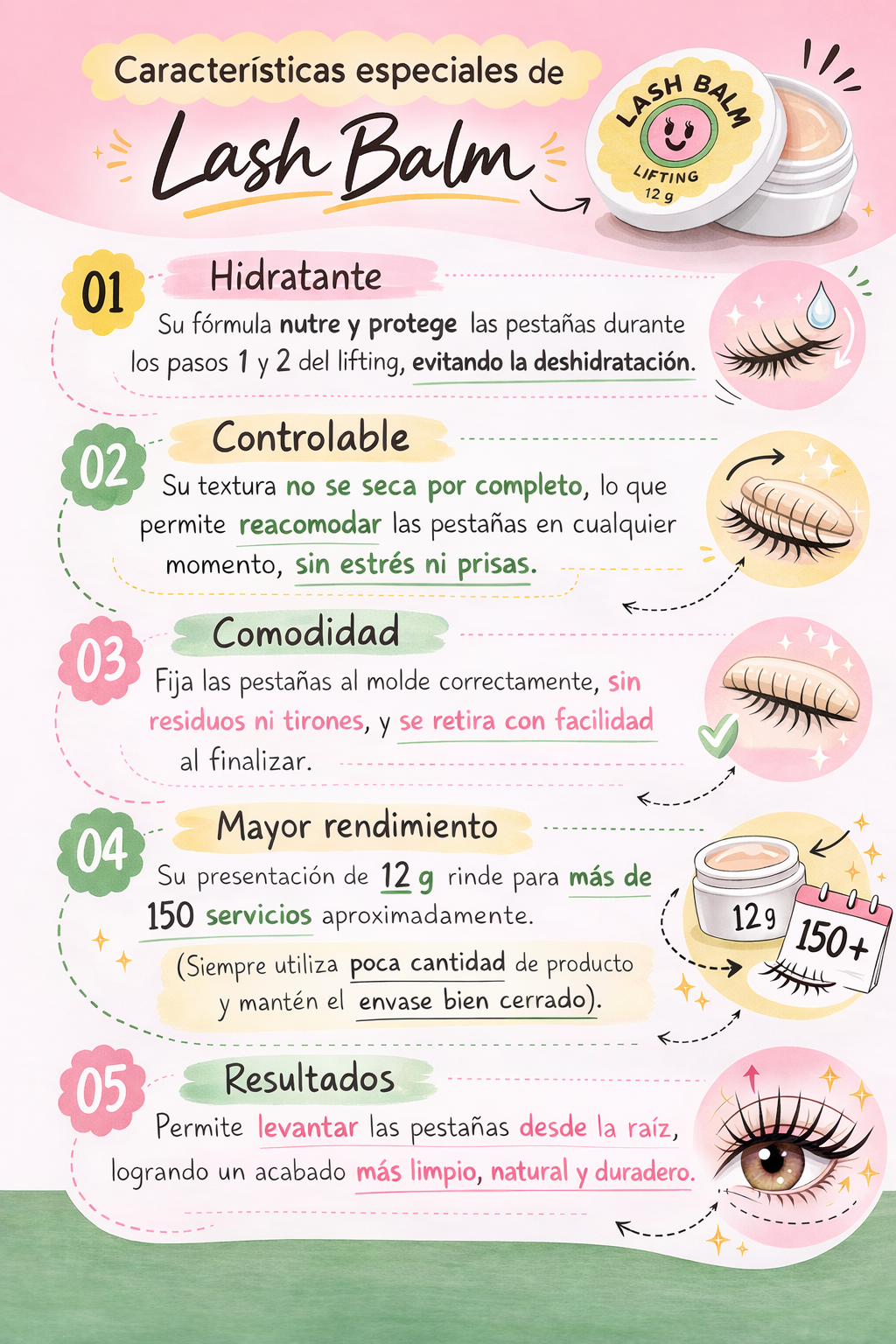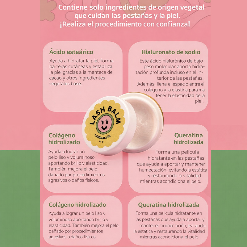 Su fórmula contiene ingredientes hidratantes y acondicionadores como colágeno, glicerina y ácido hialurónico, que ayudan a proteger las pestañas naturales, evitando la deshidratación durante los pasos del lifting o laminado. Además, reduce residuos y mejora la comodidad tanto para el profesional como para la clienta.